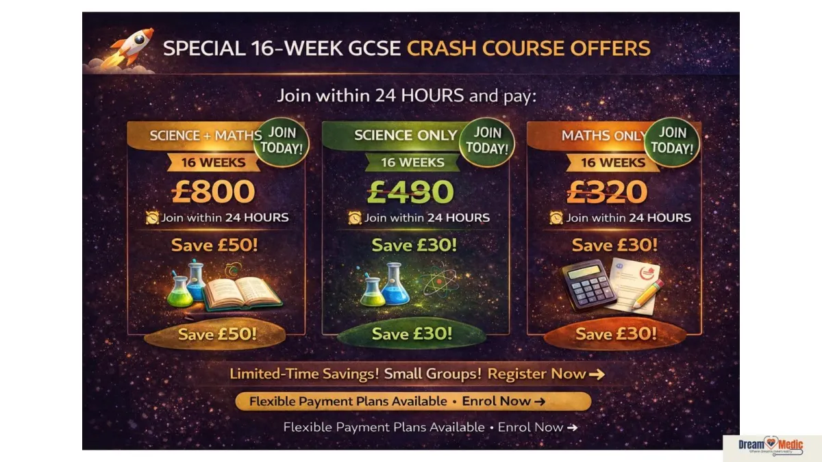 The course covers full GCSE Science & Maths topics, common exam questions, and problem-solving techniques, with a strong emphasis on exam strategy and clarity. Whether you’re revising close to exams or need structured support to improve grades, this crash course provides focused, high-impact preparation to help students perform at their best.